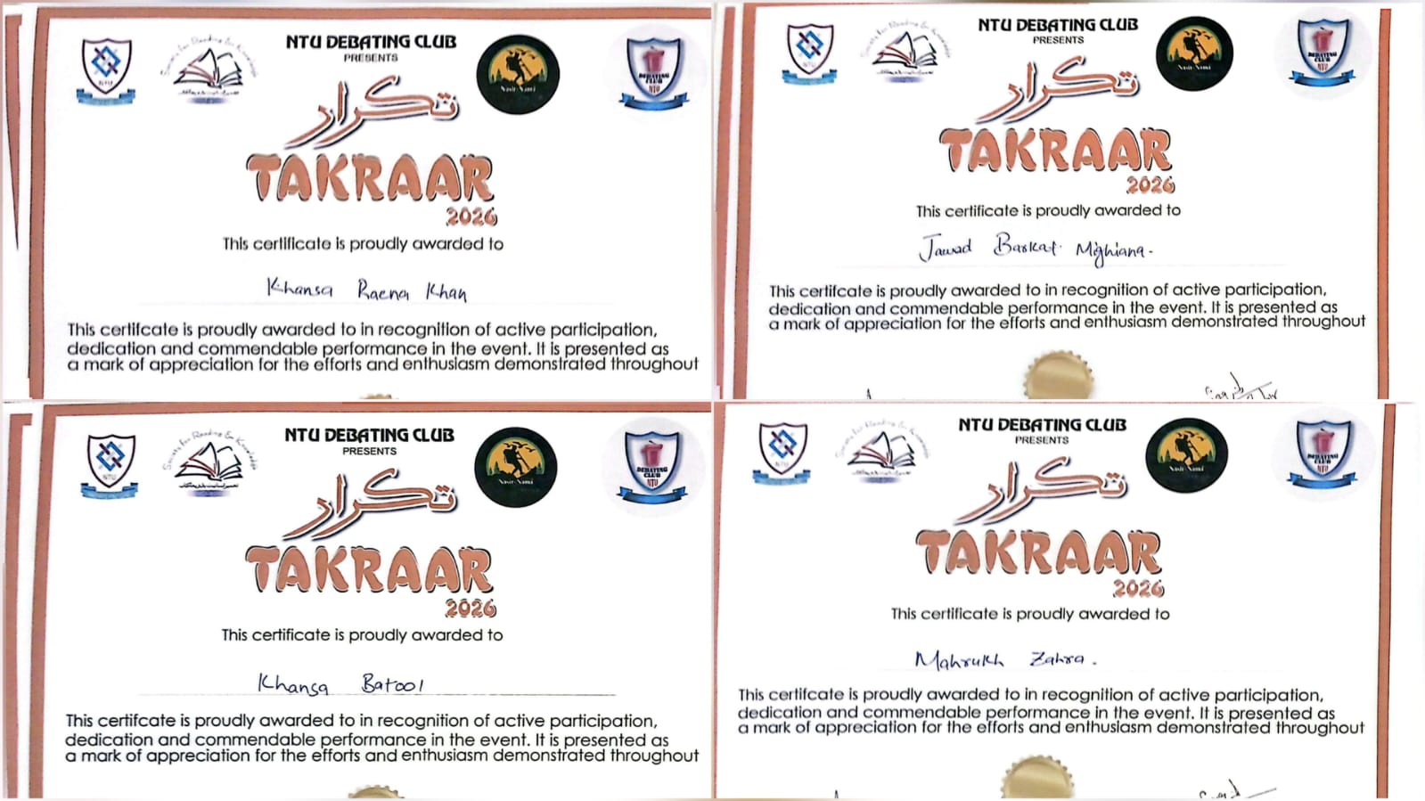 17 فروری 2026 کو نیشنل ٹیکسٹائل یونیورسٹی، فیصل آباد کے ڈیبیٹنگ کلب کی جانب سے منعقد ہونے والے 6ویں آل پاکستان بائیلنگول (اردو اور انگریزی) تقریری مقابلے "تکرار" میں یونیورسٹی آف جھنگ کے طلبہ نے بھرپور شرکت کی۔