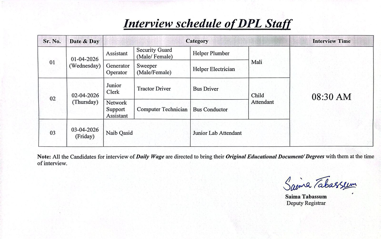 All the candidates for the interview of Daily Wage are directed to bring their Original Educational Document/ Degrees with them at the time of the interview.